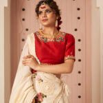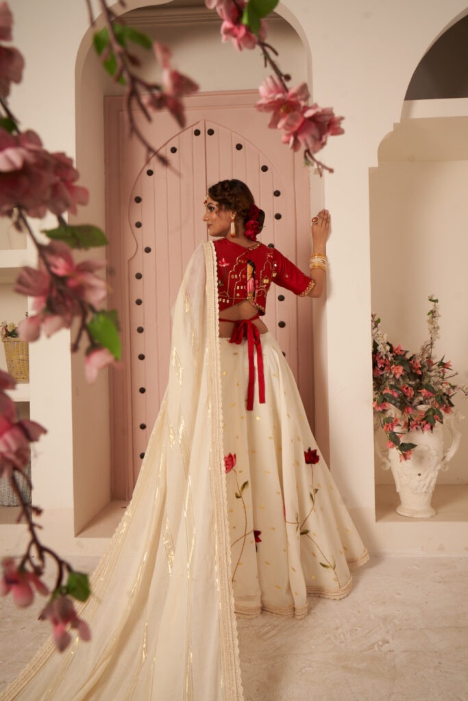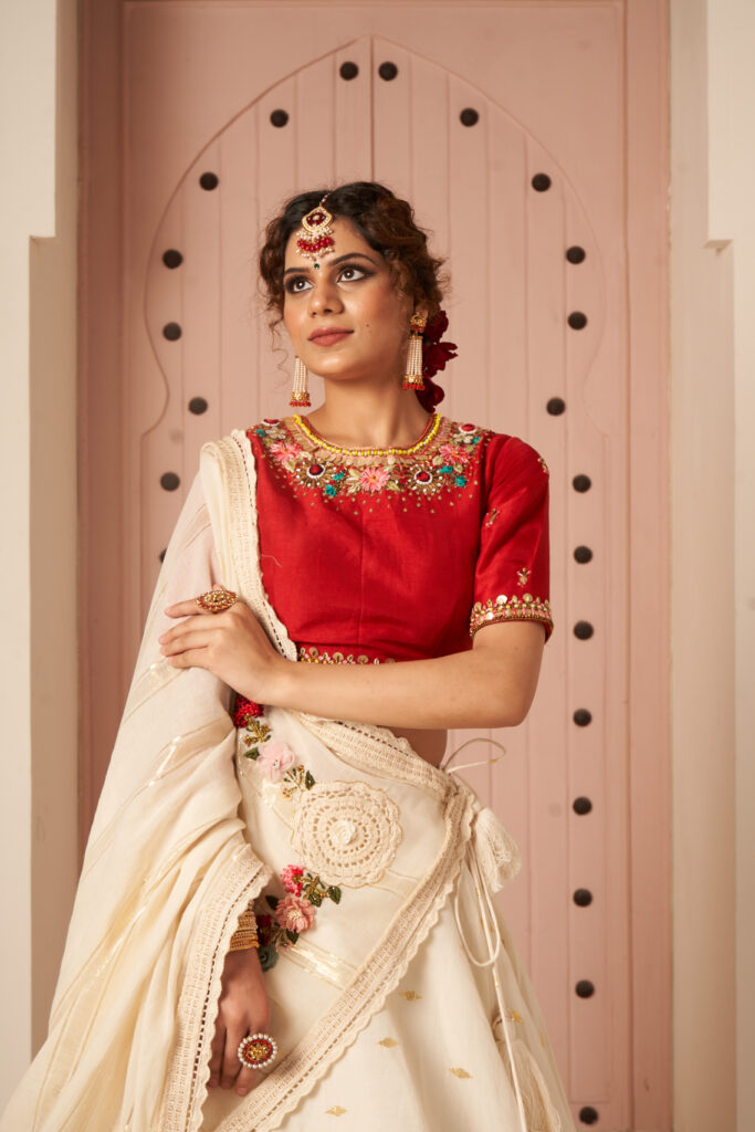 vermilion red blouse at peak of its beauty