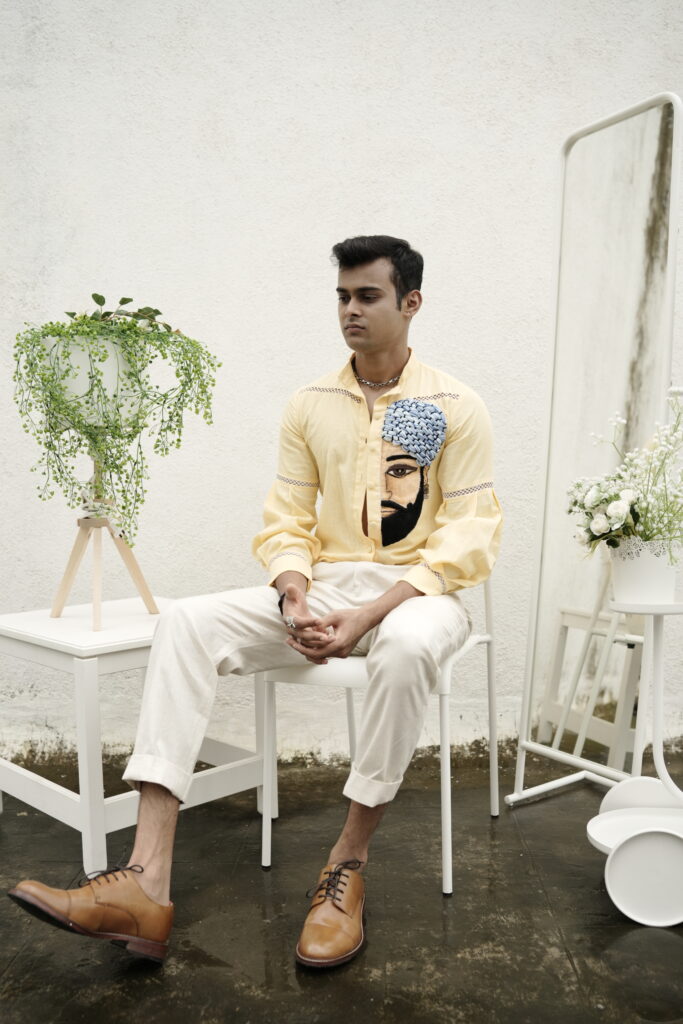 LEMON YELLOW SHIRT WITH HALF-BEARD MAN MOTIF AND LACE-INSERT BISHOP SLEEVES