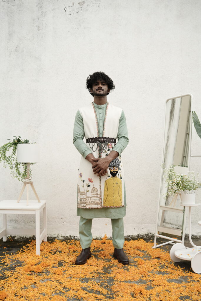 MINT GREEN KURTA SET WITH HAND EMBROIDERY WHITE LONG JACKET