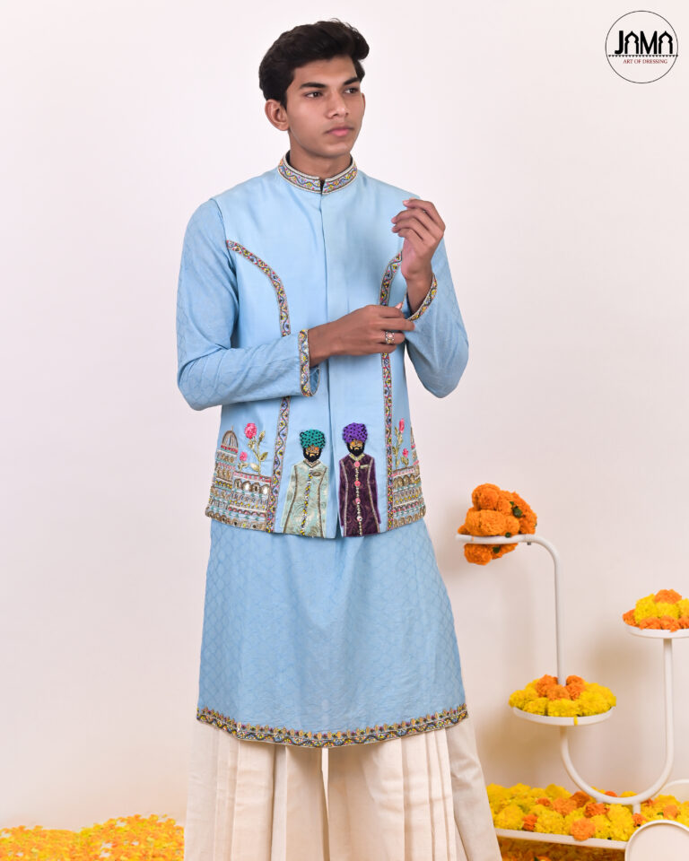 POWDER BLUE BUNDI SET WITH PLEATED PANTS