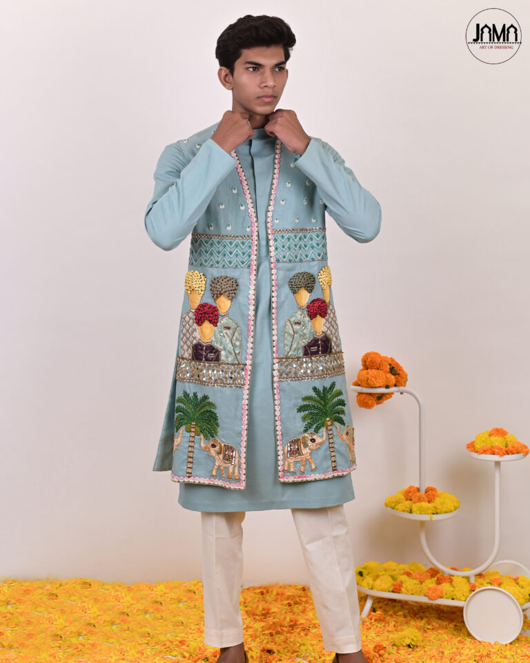POWDER BLUE EMBELLISHED LONG OPEN JACKET WITH MATCHING KURTA AND PANTS